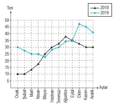 Bir ilimizin 2018 ve 2019 yıllarında aylık kuru yemiş ihracat miktarı grafikte gösterilmiştir.