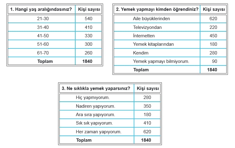 1840 kişiyle yapılan bir ankette yer alan sorular ve bu sorulara verilen cevapların dağılımı tablolarda gösterilmiştir.