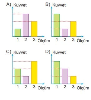 Şeyma elindeki dinamometre ile aşağıdaki cisimleri asarak sırasıyla ölçüm yapıyor. Ölçümleri bulduktan sonra değerleri grafikte gösteriyor.