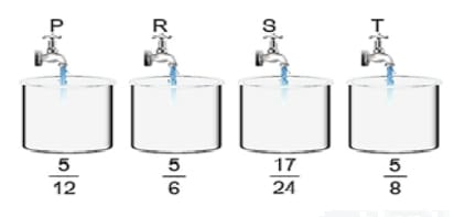 Yukarıda P, R, S ve T musluklarının bir saatte eşit büyüklükteki kapların doldurabildikleri kısımları kesirlerle ifade edilmiştir.