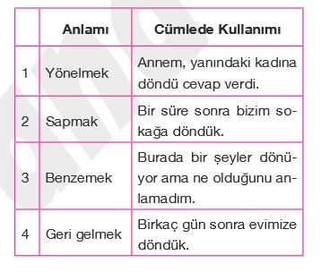 ''Dönmek” sözcüğü yukarıdaki tablonun kaçıncı satırında belirtilen anlamına uygun kullanılmamıştır?