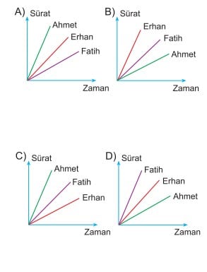 Buna göre koşucuların sürat – zaman grafikleri aşağıdakilerden hangisi olabilir?