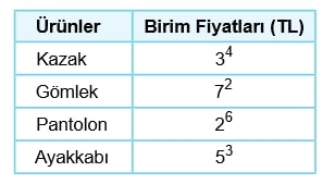 Bir mağazadaki bazı ürünlerin birim fiyatları tabloda verilmiştir.