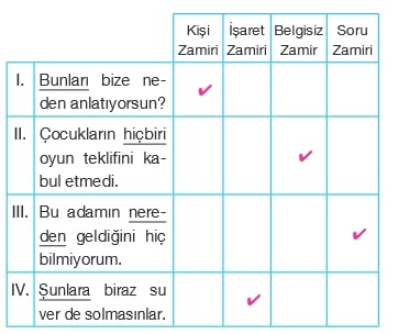 Bu tabloda numaralanmış cümlelerdeki altı çizili zamirlerden hangisinin türü yanlış işaretlenmiştir?