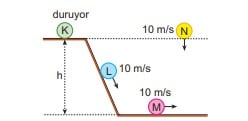 Sürat değerleri ve konumları şekildeki gibi olan, eşit kütleli K, L, M ve N cisimlerinden hangisinin mekanik enerjisi en büyüktür? (Sürtünmeler ihmal edilecektir.)