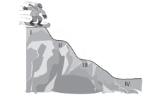 Şekilde kayak yapan bir sporcunun numaralandırılmış farklı konumları verilmiştir. Sporcu I. konumdan IV. konuma kadar kaymaya devam etmektedir.