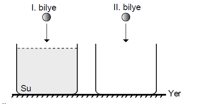 Bir öğrenci özdeş bilyeleri şekildeki gibi aynı anda aynı yükseklikten biri su dolu, diğeri boş olan kaplara bırakıyor.