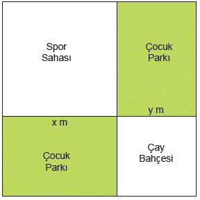 Kare şeklindeki bir arsada kenar uzunluğu x m olan kare şeklinde bir bölge spor sahası, kenar uzunluğu y m olan kare şeklinde bir bölge de çay bahçesi olarak aşağıdaki gibi planlanmıştır. Kalan bölgeler ise çocuk parkı olarak ayrılmıştır.