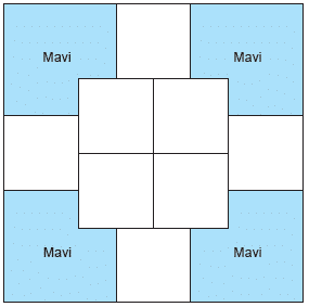 Kare şeklindeki bir kâğıdın bir yüzü aşağıdaki gibi sekiz eş beyaz bölgeye ve dört eş mavi bölgeye ayrılmıştır.