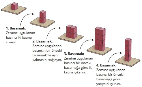 Özdeş küpler kullanılarak katı basıncı ile ilgili aşağıdaki etkinlik yapılacaktır. Bunun için, masanın üzerine bir adet küp konularak etkinliğe başlanacak ve her bir basamak için verilen talimatlar yerine getirilecektir.