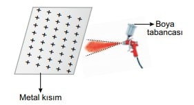 Metal kısım (+) yükle, boya tanecikleri ise (-) yükle yüklüdür.