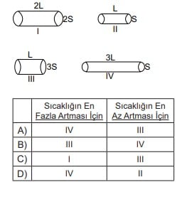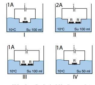 Yukarıda verilen kaplardaki eşit süre çalıştırılıyor ve son sıcaklıkları ölçülüyor. Ege I ve III, Deniz II ve III, Aslı I ve IV nolu kaplardaki suların sıcaklıklarını karşılaştırıyorlar.