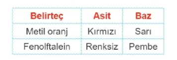 Baz belirteçlerin asit ve bazlarla etkileşimi sonucu oluşan değişimler tabloda verilmiştir.