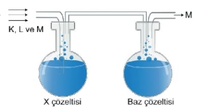 Şekildeki kaplarda X çözeltisi ve baz çözeltisi bulunmaktadır. Sırasıyla K, L, M gazları ve x çözeltisi gönderiliyor. Gazlardan biri asidik, biri bazik diğeri ise nötr özelliktedir.