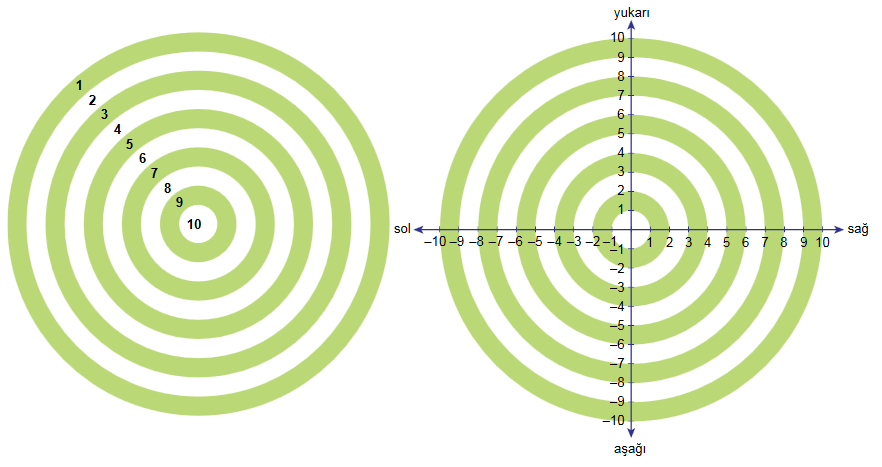 Yukarıda bir hedef tahtası ve bu hedef tahtasındaki dairesel şeritlerin vurulmaları durumunda kazandıracağı puanlar verilmiştir. Bu hedef tahtasının üzerine sağdaki gibi orijini hedef tahtasının tam orta noktası olacak şekilde bir koordinat sistemi yerleştiriliyor.