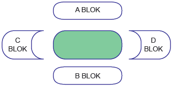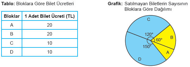 Yukarıda oturma planı verilen stadyumda oynanacak bir maç için satışa çıkarılan biletlerin %80’i satılmıştır. Biletlerin bloklara göre ücretlerini gösteren tablo ve satılmayan biletlerin sayısının bloklara göre dağılımını gösteren daire grafiği aşağıda verilmiştir.