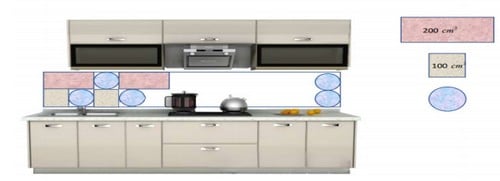 Aşağıda bir mutfak dolabının arasına bulunan uzunluğu 2,5 m’den kısa olan dikdörtgen biçimindeki boşluğa dizilecek alanı 200 cm² olan dikdörtgen fayans, alanı 100 cm² olan kare fayans ve daire biçimindeki fayanslar gösterilmiştir.