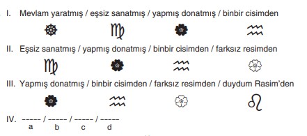 Buna göre dörtlüğün son dizesinin sembolleri aşağıdakilerin hangisinde sırasıyla doğru verilmiştir?